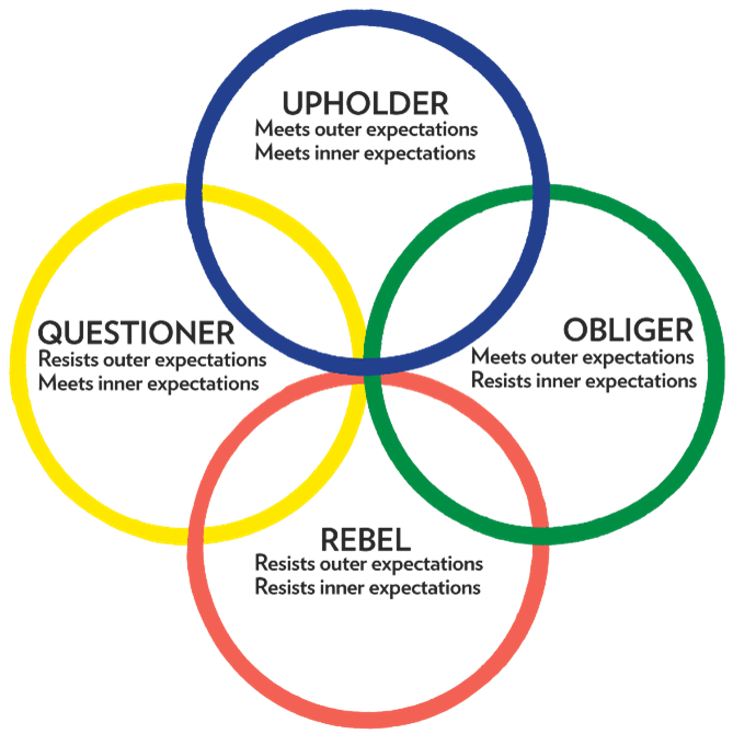 Rubin suggests that there are four tendencies that people have when it comes to managing our inner and outer expectations: Upholders, Questioners, Obligers, and Rebels. Everyone can fall under each and all these tendencies depending on the situation. However, it’s useful to think about our dominant tendency – that is the tendency we tend to default to most often.
